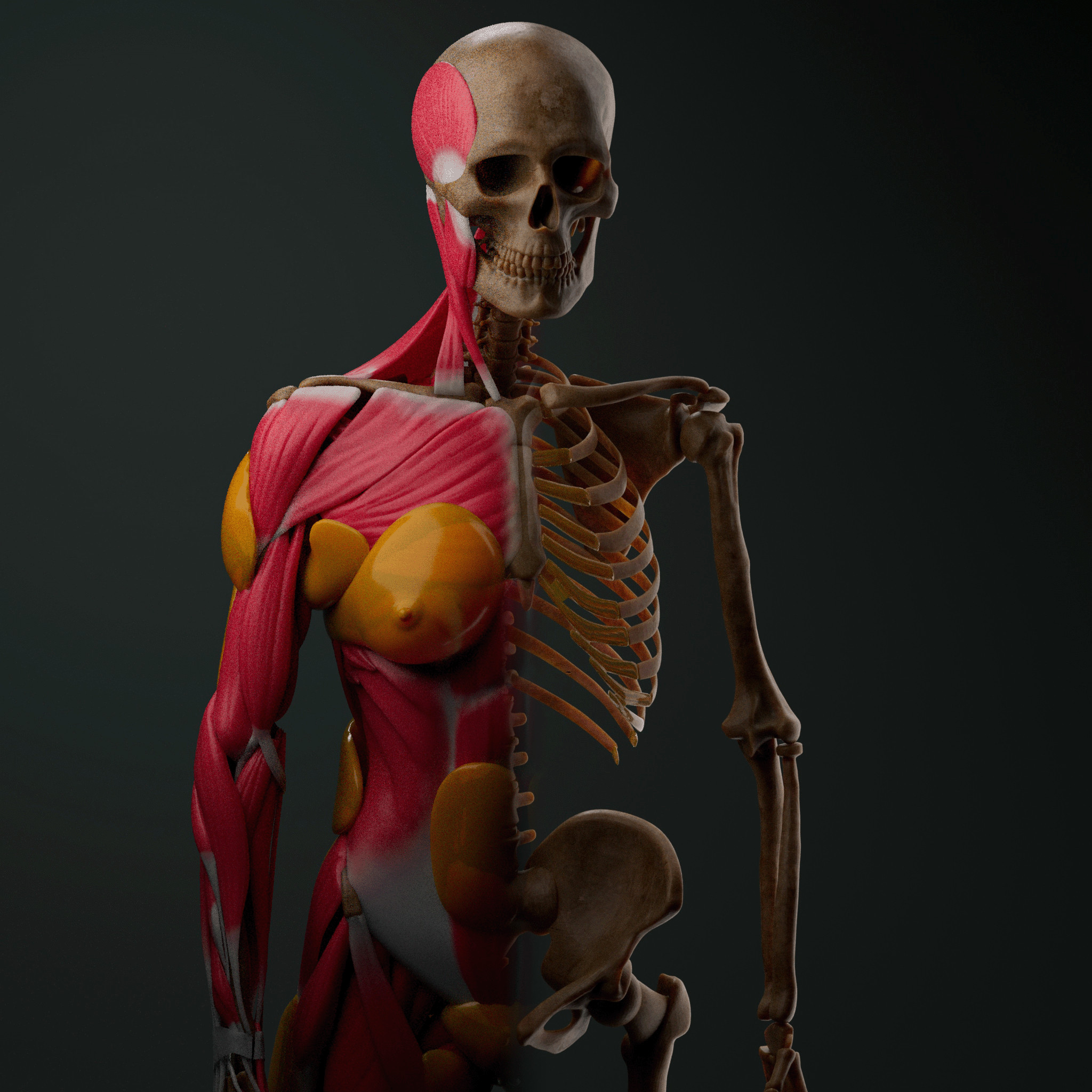 Human Female Anatomical Écorché Model. A work In Progress. So far, I have added nearly every bond, muscle and major subcutaneous fat pad. Created in reference to life, photography, and saveral of my favourite anatomy books.